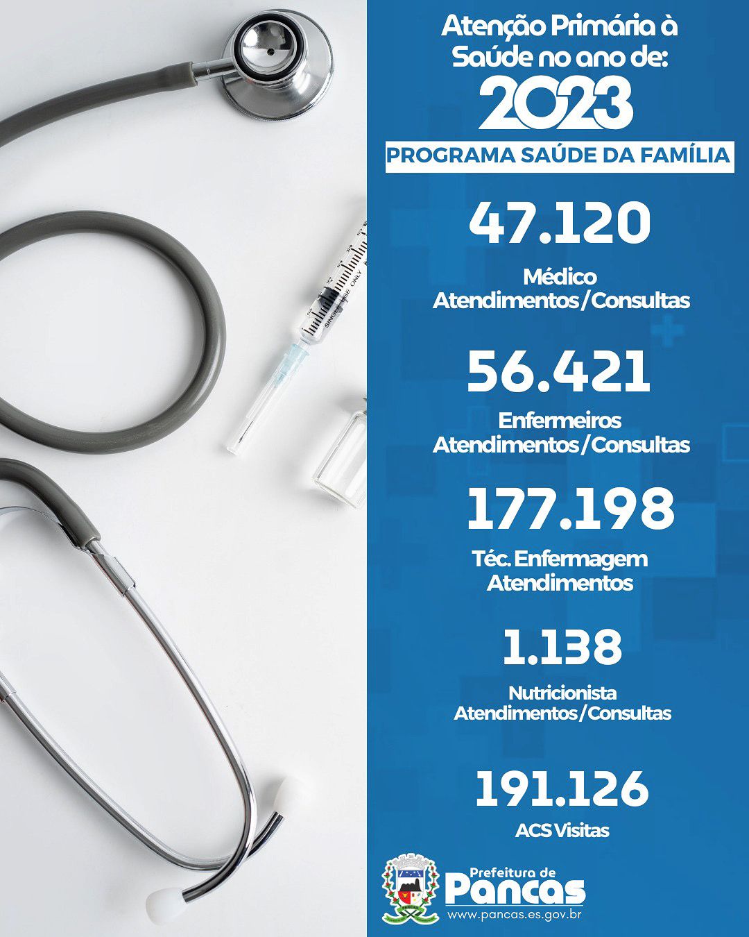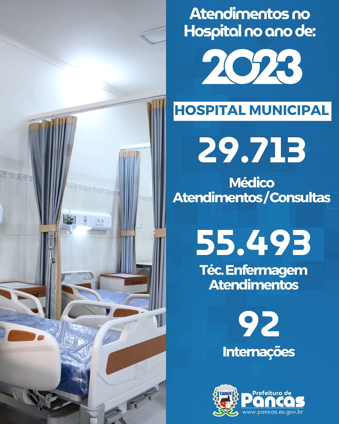 Os números apresentados destacam todos os atendimentos prestados em favor da população. No Hospital Municipal de pancas, foram realizados 29.713 atendimentos, abrangendo 55.493 consultas médicas, 92 internações e 92 atendimentos pela equipe de Técnicos de Enfermagem.
