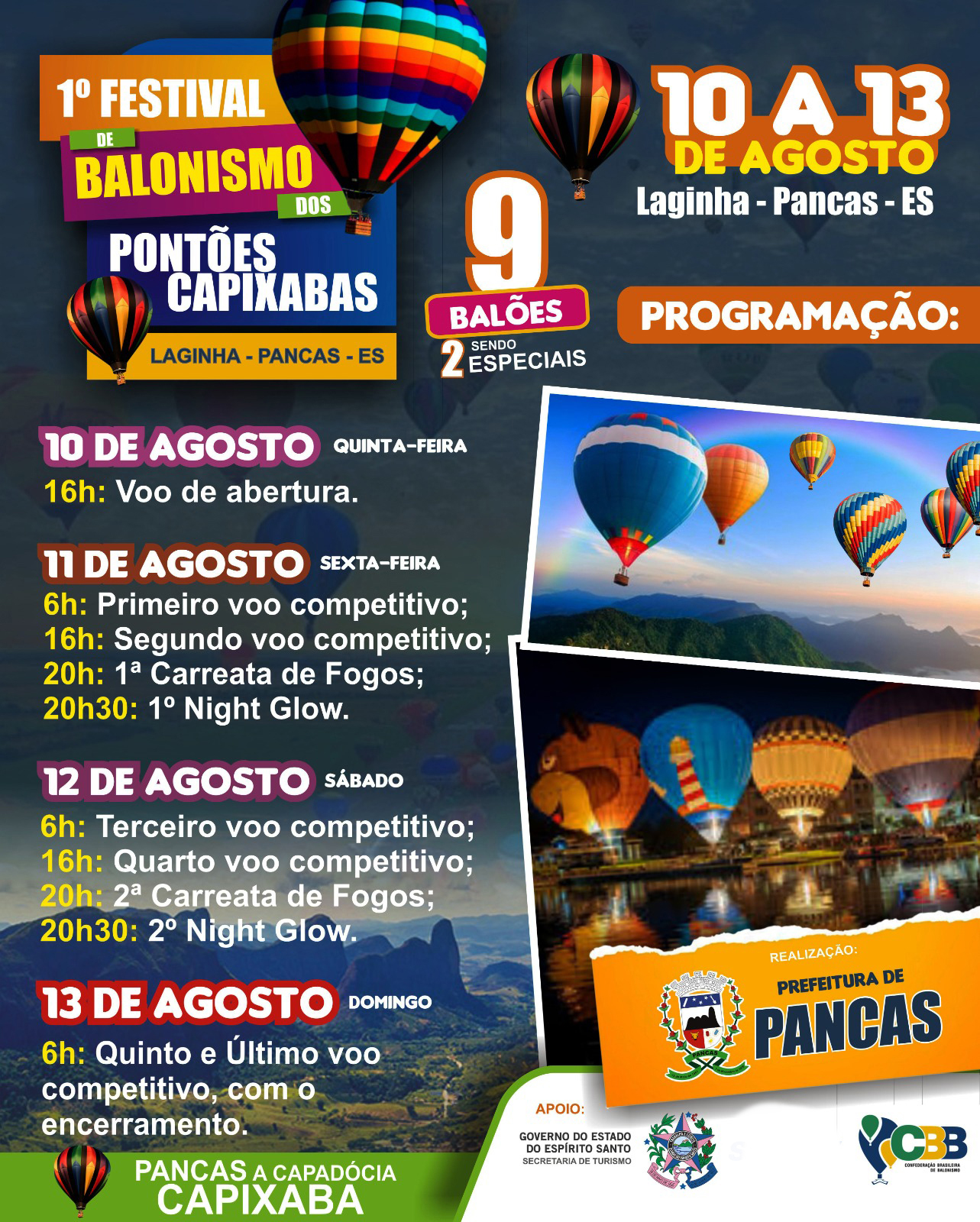 Com a confirmação dos balões especiais e demais atrações, a expectativa para o 1º Festival de Balonismo dos Pontões Capixabas e a 11ª edição da Pomerfest só aumenta. Prepare-se para dias de encantamento, aventura e diversão no céu de Laginha de Pancas entre os dias 10 e 13 de agosto. Esteja presente para presenciar voos incríveis e celebrar a cultura e a magia do balonismo na encantadora região dos Pontões Capixabas.