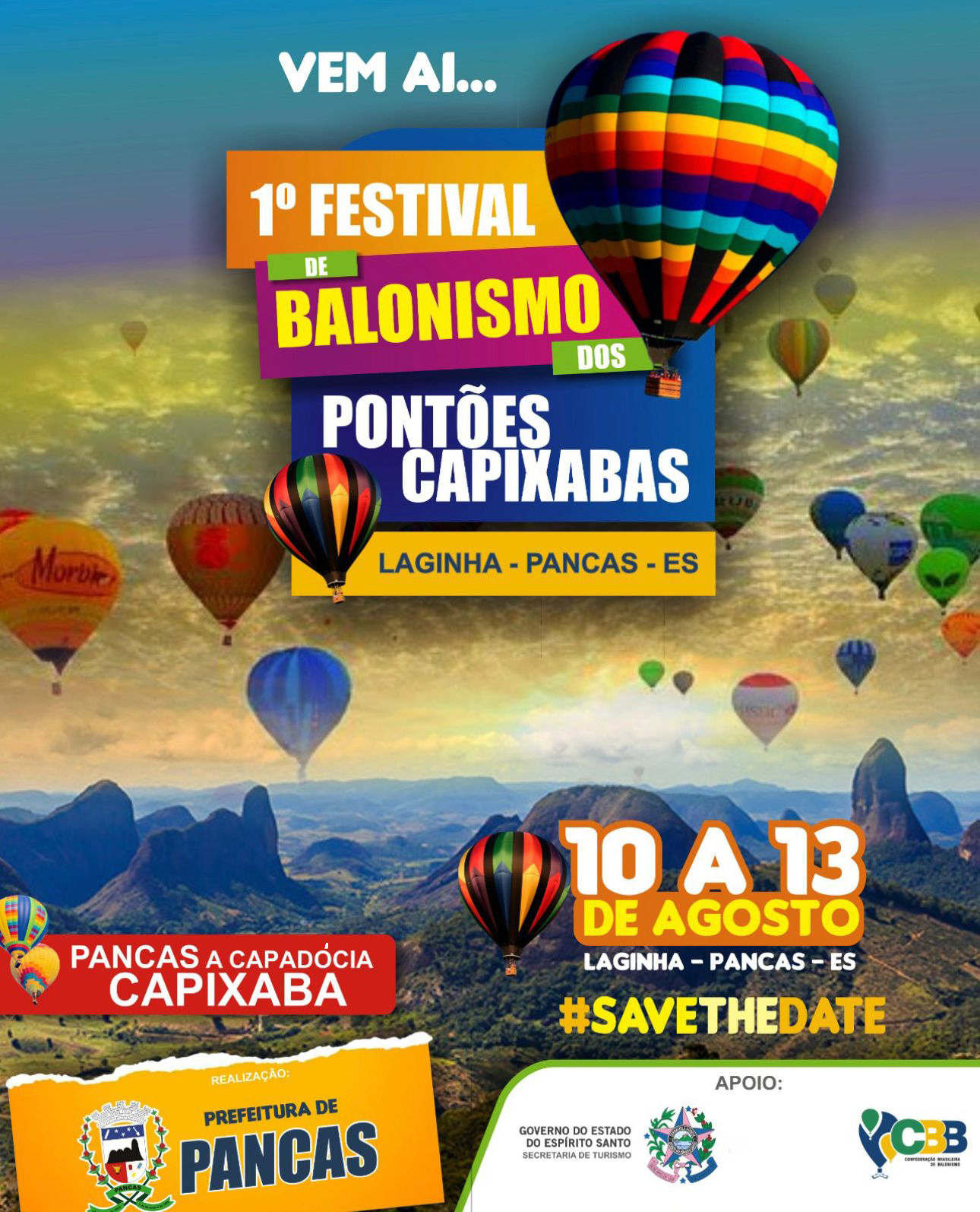 Laginha de Pancas está se preparando para receber um dos eventos mais emocionantes da região dos Pontões Capixabas. O 1º Festival de Balonismo dos Pontões Capixabas, em conjunto com a 11ª edição da Pomerfest, promete encantar moradores e visitantes entre os dias 10 e 13 de agosto. E, para tornar o evento ainda mais especial, foram anunciados hoje os balões especiais que farão parte dessa incrível jornada pelos céus de Pancas: o “Baby Car” e o “Pica Pau”.