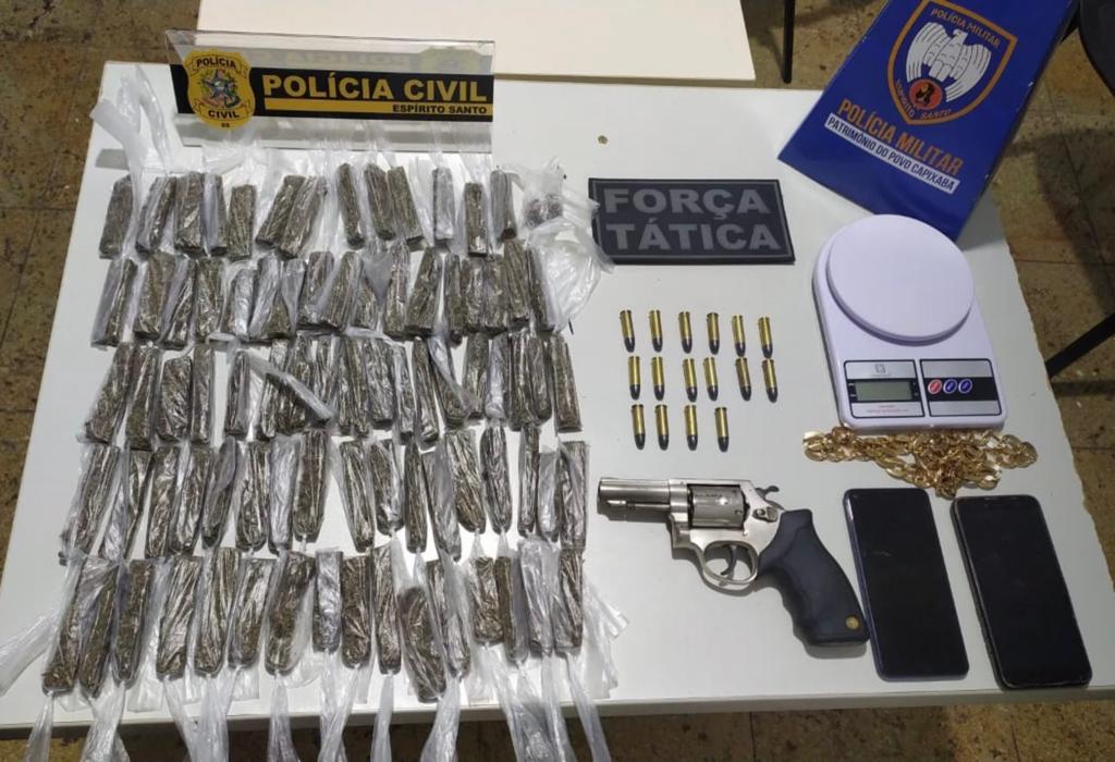 Durante a operação, foram conduzidos dois homens e apreendidos diversos materiais ilegais. Entre os itens encontrados, destacam-se um revólver Taurus calibre 38 Special, uma espingarda Rossi calibre 36, 16 munições CBC calibre 38 Special, sete cartuchos CBC calibre 36, 82 buchas de maconha, 90 pedras de crack, uma unidade e uma grande quantidade de maconha, um recipiente contendo pólvora, uma quantia em dinheiro no valor de R$ 69,00, duas balanças de precisão, celulares e um cordão dourado.