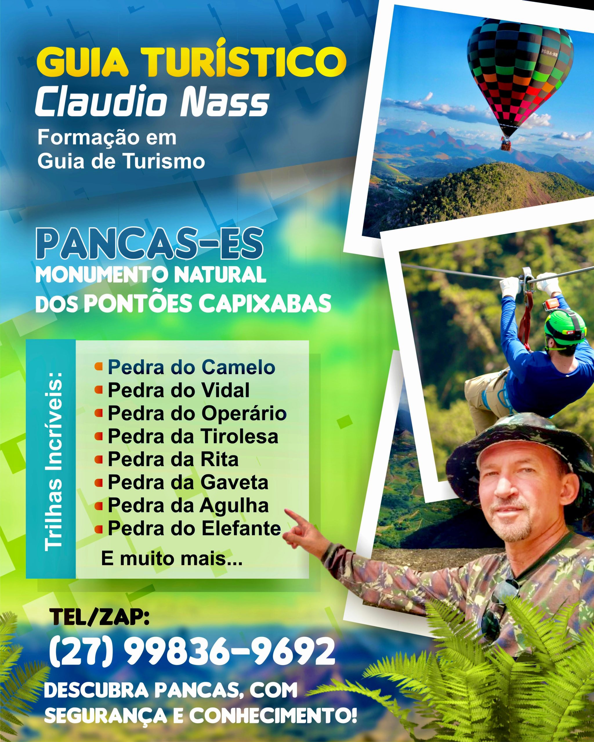 Claudio Nass leva você por trilhas que revelam os segredos e as belezas naturais da região de Pancas, onde se localizam muitas das trilhas espetaculares, entre elas: Pedra do Camelo, uma trilha que desafia e recompensa com vistas panorâmicas deslumbrantes; Pedra do Vidal, Pedra do Operário, Pedra da Tirolesa, Pedra da Rita, Pedra da Gaveta, Pedra da Agulha e a Pedra do Elefante. E muito mais espera por você no Monumento Natural dos Pontões Capixabas. Cada trilha oferece uma experiência única, desde desafiadoras subidas até momentos de relaxamento em piscinas naturais.