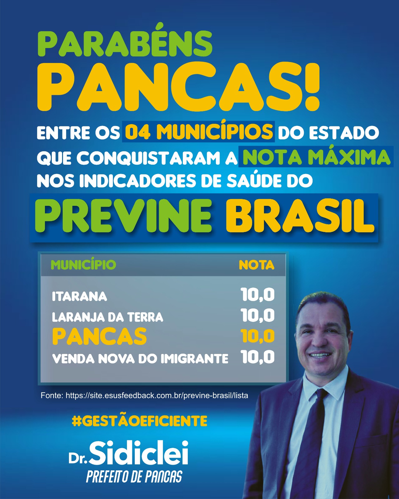 O prefeito de Pancas, Dr. Sidiclei, comemorou esses resultados de maneira efusiva, destacando a importância da saúde como prioridade em sua gestão. Em suas palavras, “Este é um momento de grande orgulho para todos nós em Pancas. Conseguir a nota máxima no Previne Brasil é um testemunho do nosso compromisso com a saúde de nossos cidadãos. Quero agradecer a toda a equipe da saúde e a todos os envolvidos por seu trabalho árduo e dedicação incansável.”