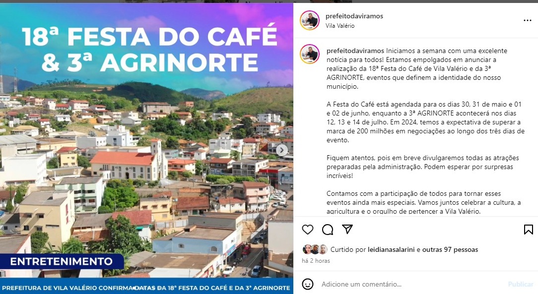 O prefeito de Vila Valério, Davi Ramos, em um comunicado divulgado nas redes sociais, anunciou com entusiasmo a realização da 18ª edição da prestigiada Festa do Café de Vila Valério e da 3ª AGRINORTE. Ele enfatizou a importância desses eventos como pilares fundamentais na definição da identidade e no fortalecimento dos laços comunitários do município. Segundo o prefeito, essas celebrações não apenas destacam a rica herança cultural e agrícola da região, mas também servem como vitrine para os avanços e inovações no setor.