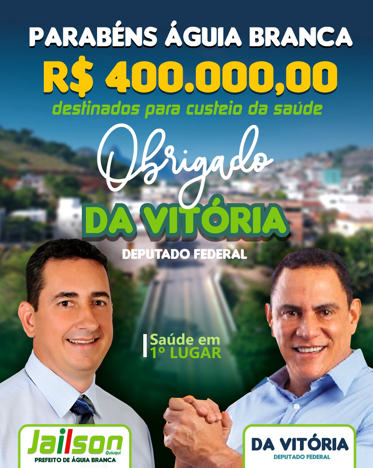 Águia Branca acaba de receber uma conquista significativa para a área da saúde. Graças à atuação do prefeito Jailson Quiuqui, foi assegurada uma emenda no valor de 400 mil reais destinada ao custeio de serviços de saúde no município. Esses recursos foram conquistados através do deputado federal Da Vitória, deputado de Águia Branca, que recebeu a maior quantidade de votos na última eleição para federal.