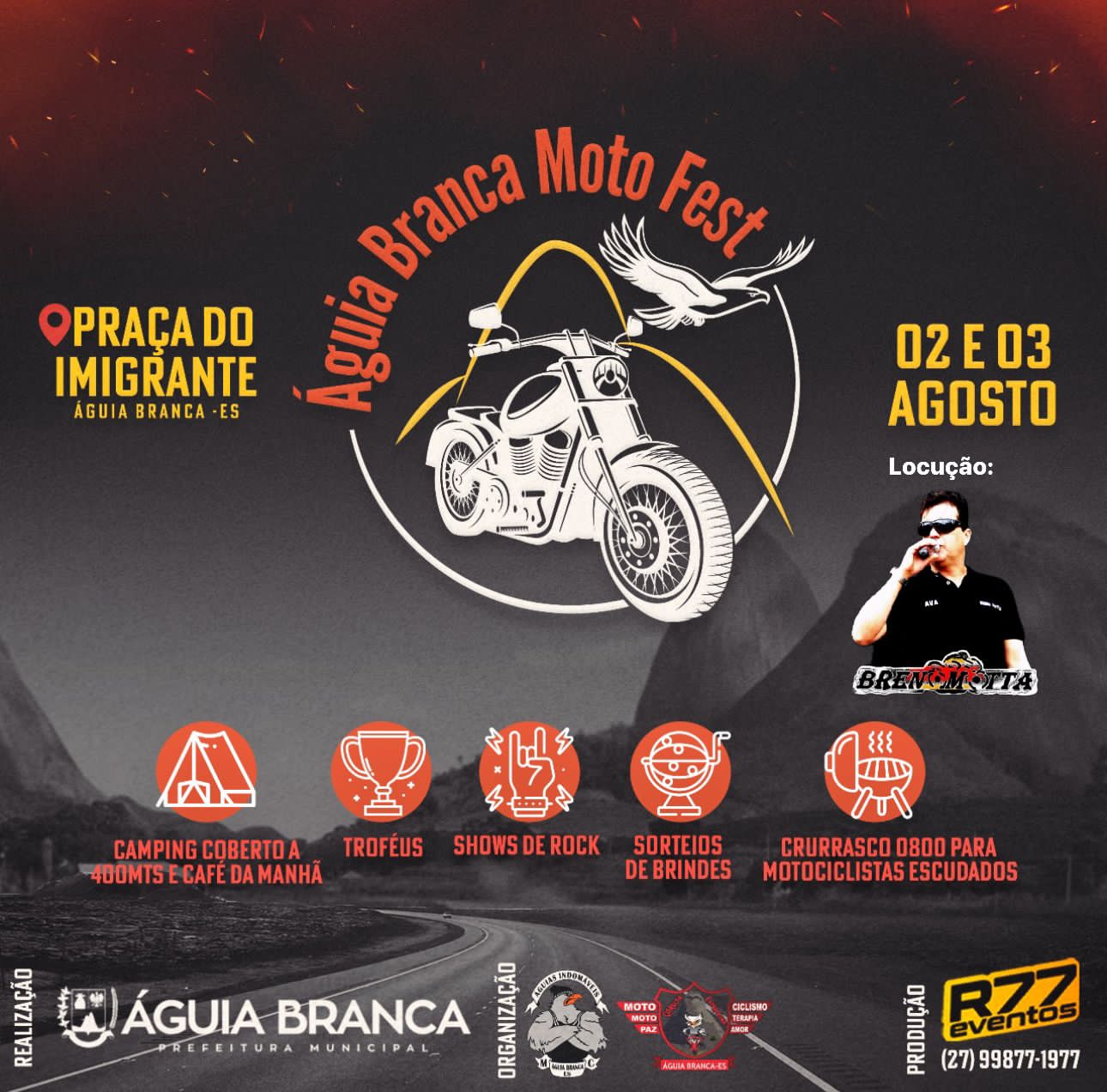 Águia Branca, será um grande destino para os motociclistas no Espírito Santo, o município está prestes a ser tomado pelo rugido magnifico dos motores, ao som eletrizante de muito rock ‘n’ roll e a camaradagem inigualável que só os verdadeiros amantes das duas rodas conhecem. O Águia Branca Moto Fest está de volta, mais épico do que nunca, nos dias 02 e 03 de agosto na Praça do Imigrante, com a proposta de ter uma das maiores recepções para os motociclistas já vistas.