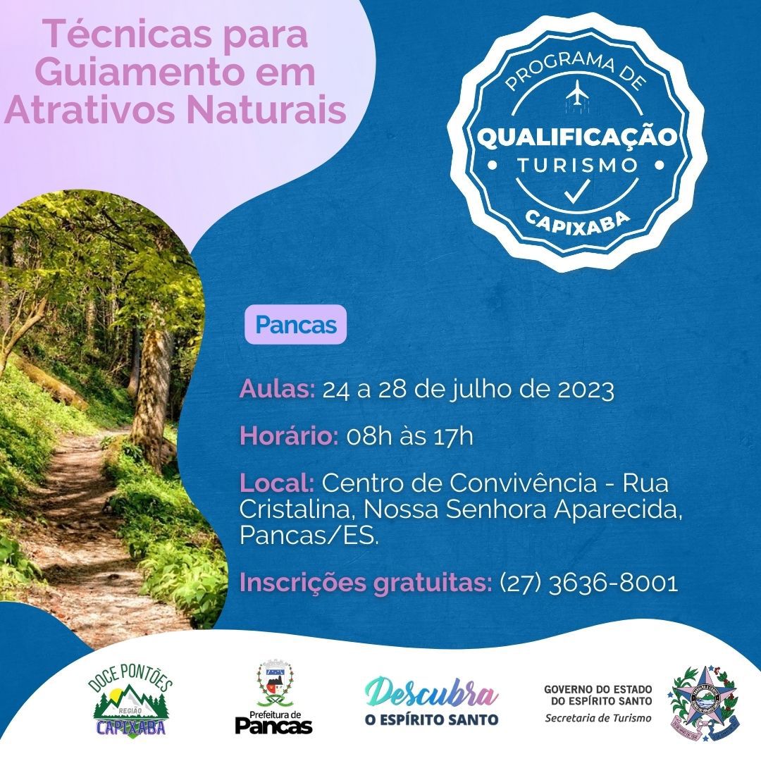 A Secretaria de Estado do Turismo (SETUR), em parceria com a Prefeitura Municipal de Pancas, está promovendo o Curso de Técnicas para Guiamento em Atrativos Naturais. O curso será realizado entre os dias 24 e 28 de julho e contará com a presença de um instrutor capacitado do SENAC.